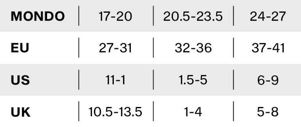 Boot: Hard-shell one-piece composite plastic with adjustable sizing (EU 27-31, 32-36, 37-41)